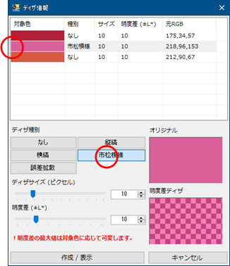 2. 変更したい色を選び、ディザの種類を選択します。 ”作成/表示”を選択してディザ変換されます。